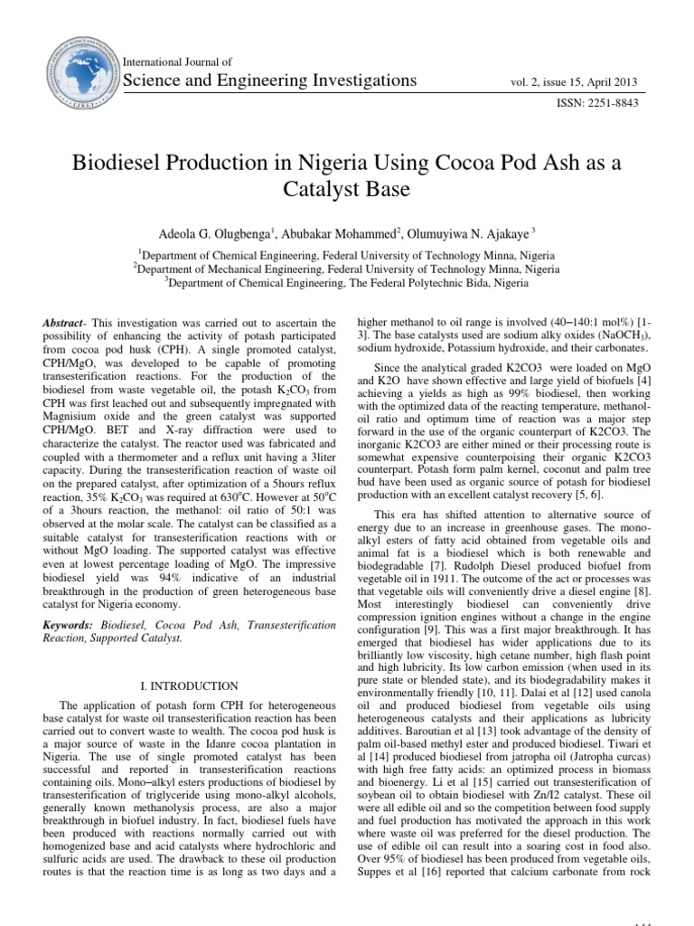 I. INTRODUCTION The application of potash form CPH for heterogeneous base catalyst for waste oil transesterification reaction has been carried out to convert waste to wealth. The cocoa pod husk is a major source of waste in the Idanre cocoa plantation in Nigeria. The use of single promoted catalyst has been successful and reported in transesterification reactions containing oils. Mono