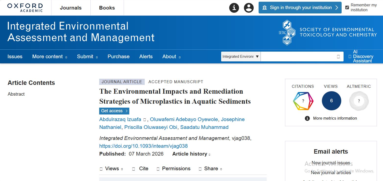 | Citation: | Izuafa, A., Oyewole, O. A., Nathaniel, J., Obi, O.P., & Muhammad, S. (2026). The Environmental Impacts and Remediation Strategies of Microplastics in Aquatic Sediments. Integrated environmental assessment and management, vjag038. Advance online publication. https://doi.org/10.1093/inteam/vjag038 |